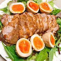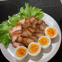 豚バラ肉をコトコト煮込んでつくる本格派チャーシューです。生姜やニンニク、長ネギの香りが食欲をそそり、お肉はしっとりジューシーな仕上がりに。タレは醤油とみりん、はちみつのバランスが絶妙で、ラーメンのトッピングやチャーシュー丼、炒飯など様々なアレンジが楽しめます。タレに漬け込んだ煮玉子を添えれば、まるで専門店のような一品に。作り置きにも便利です。