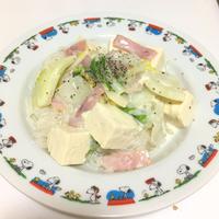 全体的にはカルボナーラ感満載で美味しいですが、個人的には豆腐はない方がいいかと思いました。春雨は白滝で代用しました。黒胡椒や粉チーズをかけても合います。