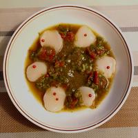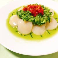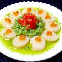 - 3 お皿にホタテ貝柱を並べ、2をかけて完成です。