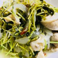- 1 豆苗は根元を切り落とし、3等分に切ります。玉ねぎは薄切りにします。