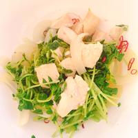 - 4 3.のボウルに鶏もも肉、玉ねぎ、豆苗を入れ、ふんわりとラップしたら600Wのレンジで3分加熱します。