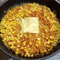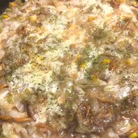 キャベツ多め、天かす、干しいか、かつおぶし、コーン、お餅、ベビースターラーメン。ピザ用チーズを多めに、あおのり。ホットプレートで蒸しながら、おこげをたくさん作りました。