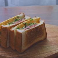 バターの香ばしい香りがたまらないサクサク食感のホットサンドです。コンビーフの塩気とブロッコリースプラウトのみずみずしさが絶妙なバランス。作り方は材料を挟んで焼くだけの簡単レシピ。マヨネーズに粒マスタードを加えるとコクが出て、より本格的な味わいに。カフェ風の見た目とボリューム感で、朝食やランチにぴったり。冷めてもカリッとした食感が持続します。