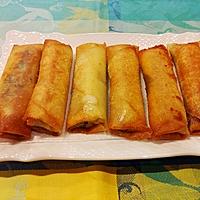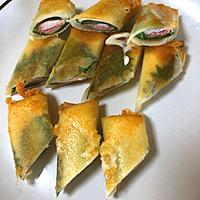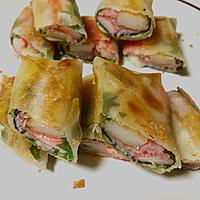 - 1 春巻きの皮に、大葉、のり、スライスチーズ、カニカマをのせます。