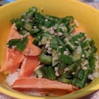 香ばしく焼き付けたサーモンに、緑色が鮮やかなオクラのとろとろソースをかけたアレンジ丼です。ねばねばとろとろとしたオクラが、サーモンに絡んでとってもおいしいですよ。ごはんにのせず、そのまま小鉢として食べるのもおすすめです。