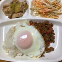 - 3 鍋にサラダ油を入れ中火で熱し、2を入れ炒めます。豚バラ肉の色が変わったら1を入れ炒めます。