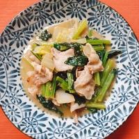 白菜と小松菜の生姜みそ炒め煮のご紹介です。白菜と小松菜の食感が、生姜が効いたみそダレとよく合います。さらに豚バラ肉を入れてますので、旨味が増しておいしいですよ。ごはんが進む一品ですので、ぜひお試しくださいね。