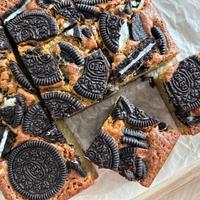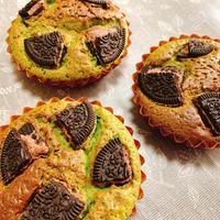 見た目もかわいらしいクッキーブラウニーを抹茶風味に仕上げました。プレゼントやパーティーにも喜ばれること間違いなしの一品ですよ。クリームサンドココアクッキーをのせる位置で見た目の仕上がりが変わるので、バランスよく飾ってくださいね。
