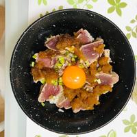 和風味の玉ねぎソースで食べるカツオステーキ丼のご紹介です。刺身の状態のカツオでも美味しく召し上がれますが、一度焼くことで香ばしくなり美味しいですよ。玉ねぎソースがカツオステーキとごはんに良く合います。是非お試しください。