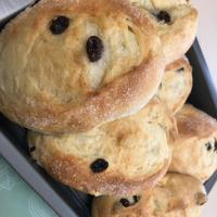 モチモチでふわふわの生地に、たっぷりのレーズンが入った贅沢なパンです。トッピングのバターとグラニュー糖が焼き上がりにサクッと香ばしい食感を演出し、ジュワッと溶け出したバターが底面まで染み渡ります。サルタナレーズンやラムレーズンを使うとより風味豊かに。くるみやクリームチーズを加えてアレンジを楽しむこともできます。扱いやすい生地で初心者でも作りやすく、翌日トーストしても美味しくいただけます。
