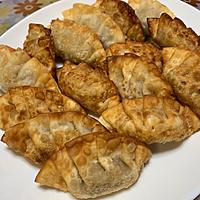 - 2 餃子の皮に1を中央にのせ、縁に水を塗り、全体を包みます。