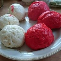 食紅を入れるタイミングが遅かったので捏ねても上手く混ざらなかったのと蒸すときの火加減が強すぎたと反省していますが、味は立派な紅白饅頭でした。自分で作れるんですね~❤