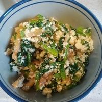 - 1 豆腐はキッチンペーパーでくるみ、ラップをせずに600Wのレンジで2分加熱して水切りをします。