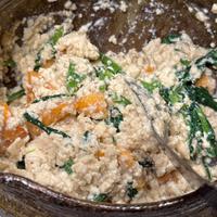 定番の白和えに秋の果物の柿をアクセントに加えました。すり鉢を使わなくても、先に豆腐と調味料を一緒にしっかり混ぜることでなめらかな食感になります。いつもの味とはちょっとちがう白和えはおもてなしにも喜ばれること間違いなしです。