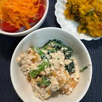 春菊は茹でた後、冷水に取ると色が変わりにくいです。豆腐と春菊の水気はしっかり切っておくと、調味料を混ぜた後も水っぽくなりません。柿は種のあるものでも作れますが、種無しで熟しすぎていないものを使うと千切りにしやすいです。