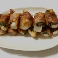 - 3 粗熱を取り、キッチンペーパーで水気を拭き取り、豚バラ肉で巻きます。
