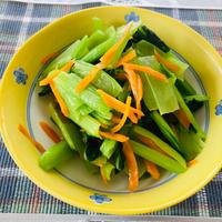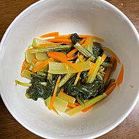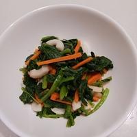 - 1 小松菜は根元を落とし、4cm程度に切ります。にんじんは皮を剥き、千切りにします。