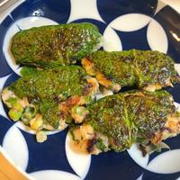 大葉がみじん切りを冷凍してあるものしかなかったので包まなかったら、成形できず💦残りはそぼろ状にして、お弁当のご飯にのせました。濃いめの味だったので、こちらの方が好きかも😂