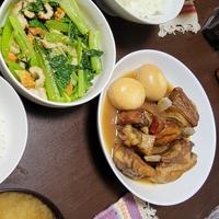 - 4 余分な油をキッチンぺーパーで拭き取り、煮汁の材料、2、鷹の爪を入れ蓋をして煮汁が1/3になるまで20分程中火で煮込みます。