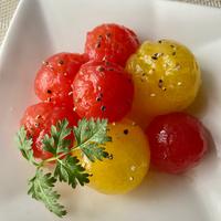 ミニトマトのマリネのご紹介です。そのままでも美味しいミニトマトですが、甘酸っぱくマリネをするとデザートのような仕上がりになります。湯剥きをすると味なじみが良く、食感も柔らかくなります。カラフルなミニトマトで作ると可愛いですよ。ぜひお試し下さい。