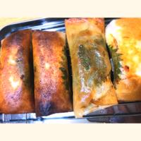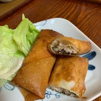 - 4 春巻きの皮に大葉、水気を拭き取った1の順に重ね、3を塗り、2を散らします。手前から巻き、巻き終わりに水溶き薄力粉を塗って留めます。