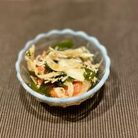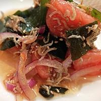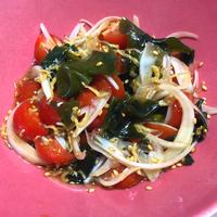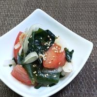トマトと生わかめを中華風サラダに仕上げてみました。新玉ねぎの辛味とちりめんじゃこの香ばしさがアクセントのサラダです。箸休めにおすすめの一品です。角切りにした豆腐を加えてもおいしいですよ。ぜひどうぞお試しください。