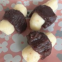 - 6 白玉団子の両端が出るようにあんこを乗せて軽く抑えます。