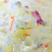 - 3 白菜の茎がしんなりしたら、牛乳、コーンクリーム缶、ホタテ、(A)の順に入れてひと混ぜしたら、蓋をして中火で煮込みます。