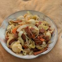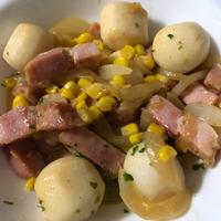 - 4 炒まってきたら、ブロックベーコン、里芋、コーン、醤油、塩胡椒を入れて炒めます