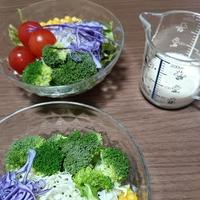- 1 ボウルに無調整豆乳、マヨネーズ、酢を入れて混ぜます。