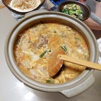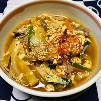 - 7 沸騰したらアクを取り除きます。(A)を入れて中火で5分程加熱し、全体がなじんだら溶き卵を回し入れ、卵が固まったら火から下ろします。