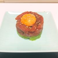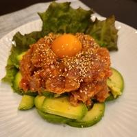 コチュジャンの風味とマグロの旨味が見事に調和した本格的な味わいです。アボカドの滑らかな食感と相性抜群で、お好みでキュウリや小松菜などの野菜を添えても楽しめます。黄身を絡めて食べると濃厚な味わいに早変わり。セルクルがなくても牛乳パックで代用できるなど、手軽に作れるのも魅力。お店のユッケの味を自宅で再現できると好評で、お酒のおつまみとしても最高です。