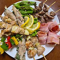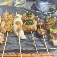 ねぎま、鶏ささみのネギ味噌ダレ、鶏ささみの梅シソ、鶏軟骨、豚バラしそ巻き、月見軟骨入り鶏つくね、ピーマン、玉ねぎ、椎茸。