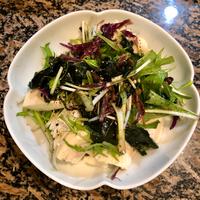 ワカメ、水菜を味噌ドレッシングで和えて豆腐にのせました
