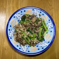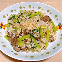 - 5 牛ロースに火が通ったら、ごはんを加え中火で炒めます。全体に混ざったら、2を加え、さっと火を通し、お皿に盛り付けて完成です。