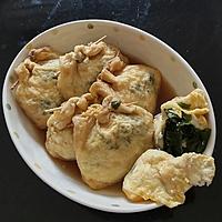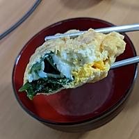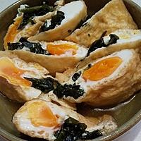 食べレポ参考に卵は小さめの器に割り入れてから油揚げに移したほうが楽ですね♫卵→わかめの順で入れると簡単に入ります♪