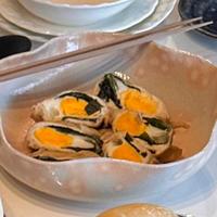 Lサイズの卵を使ったので白身があふれました😓卵の入った巾着はテンション上がります🎵わかめを入れてから、別皿に入れた卵を流し入れました。