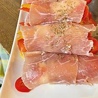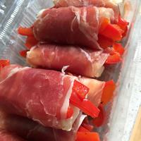 - 3 生ハムを広げ、1と2を巻き、端から出ているパプリカを切り落とし余ったパプリカを細かく刻み飾りに使います。