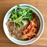 - 3 器にごはんを盛り付け、1、2、キムチをのせ、完成です。