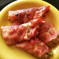 - 4 薄切りロングベーコン5枚を並べます。大葉、アスパラガス、ピザ用チーズ、えのきの順に乗せ、端から巻いていき、巻き終わりを爪楊枝で止めます。