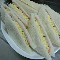 - 4 片方の食パンにハム、2を置いてもう片方の食パンをかぶせてしっかり押さえます。