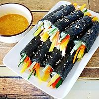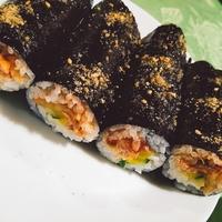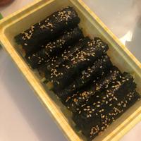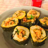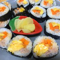 ツナは入れず胡瓜·沢庵·にんじんを入れたものとカニカマを入れたシンプルな2種類作り、麻薬キンパみたいにタレも作ってつけて食べるようにしてみました♪