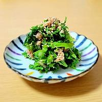 初わさび菜。わさび菜75・ささみをツナ1缶で代用・鰹節2.5g・ごま追加・他そのまま。わさび菜そのままだとちょっとクセのある味だけど食べやすい味になったかな✏️