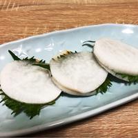 - 1 大根の皮を剥き、薄切りにします。