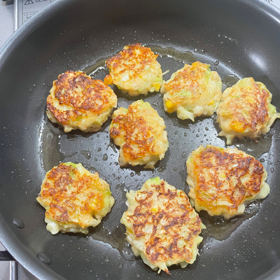 美味しかったのでまた作りました キャベツを塩揉みすると味が濃いのでレンジしました かさ増しで玉ねぎみじん切りとコーンをプラスしたら甘さ増し増しで美味しいです! 玉子の代わりにマヨネーズを使っても型崩れする事なくきれいに焼けました。