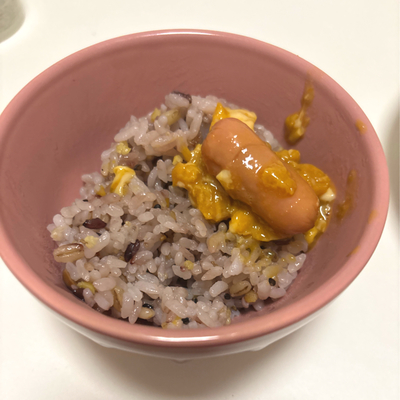 味が濃いとのことだったので、 卵2つ、粗挽きウインナー2つ、 もやし少量、調味料少し少なめ、 チーズ、ニンニク、ネギ少量プラスしました! どんぶりにして別物っぽくなりましたが、味はちょうどよく簡単で美味しかったです。