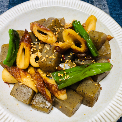 こんにゃく250g、ちくわ4本 残っていたししとう3本追加 簡単に出来て甘辛のタレが すごく美味しかったです♡