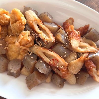 すぐできる◎♪ 炒め煮のこんにゃくちくわ♡ 調味料の量が丁度よくて 油揚げか餅巾着入り 味しみ…おいしい。