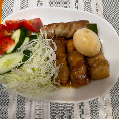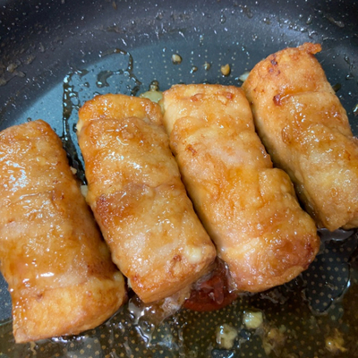 豚バラ肉が剥がれない様に、4面を中火で上手く焼くのがポイントですね。マヨを付ければ🍚がもっと進みます😅