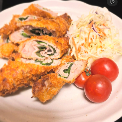 豚もも薄切りを使用!レシピ通り広げて、大葉、梅肉を巻き付け、小麦粉、マヨネーズ、卵を入れた。卵焼きでパン粉をまぶしば少量の油で焼き上がりました。これにチーズを入れて梅肉大葉、チーズのロール巻きにしても、ビールのあてにこれからの夏の季節最高です!